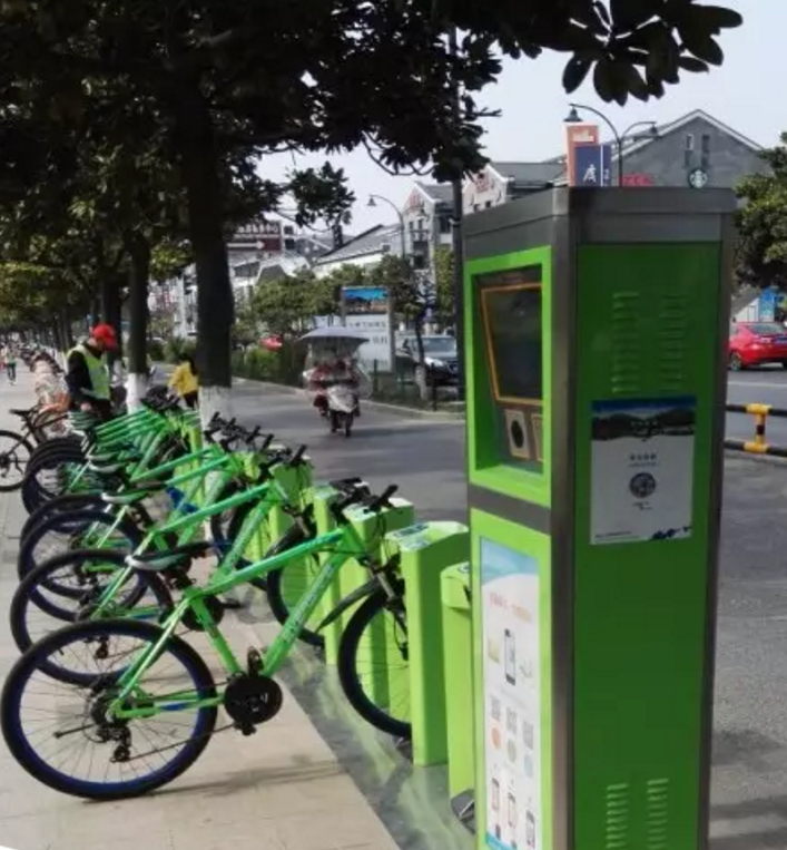 在言子墓与虞山公园之间,有一排绿色的圆柱体格外引人注目,这便是常州永安公共自行车股份有限公司在常熟虞山公园刚刚建立的又一项绿色出行的举措。