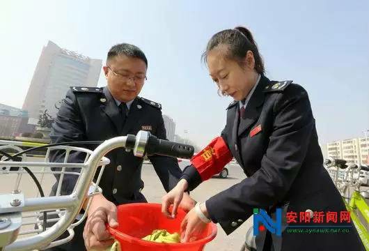 2016年3月1日,安阳市高新区七仙女转盘公共自行车租赁站点,高新区国税局的青年志愿者正在为20辆绿色环保的公共自行车进行保洁。