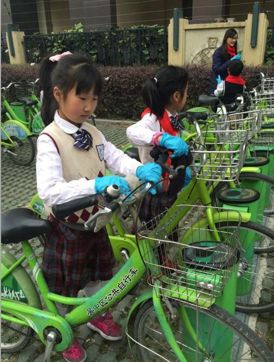 近日,连日的阴雨将路边的公共自行车沾染了污泥,为了让公共自行车重新“焕发容光”,中队辅导员发起了“我给自行车洗个澡”这一活动,提议一经提出,便得到了队员的纷纷响应。当日下午四时,十多名少先队员带着工具来到了东沙湖公共自行车停放处,对站内的自行车进行了清洗。看!这一边,一群系着红领巾的少先队员们手拿抹布,正蹲在公共自行车前,仔细地擦拭着车身的每一个角落,在他们的努力下,自行车很快变得焕然一新;那一边,另一群小队员们热群地向路过的行人宣传公共自行车知识,倡导绿色出行。