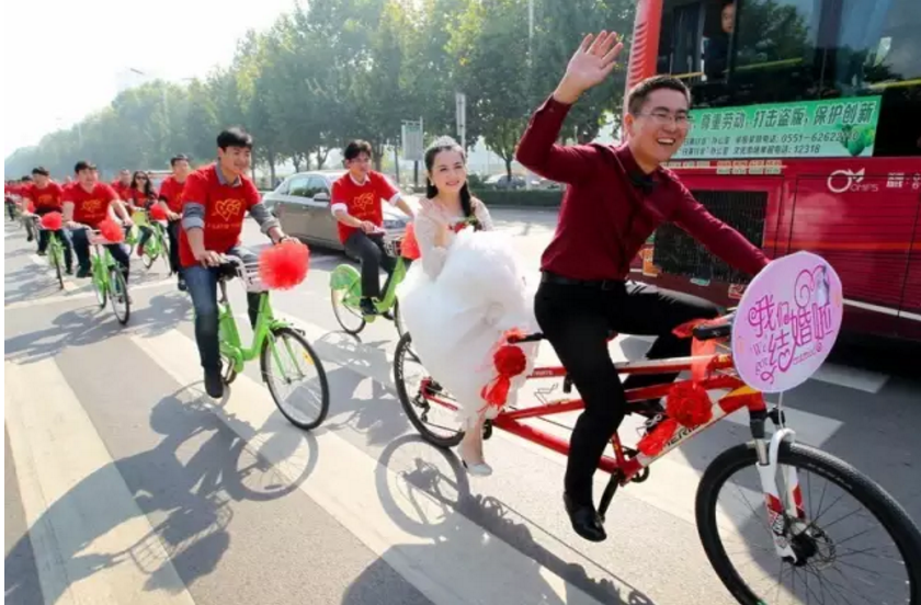 淮北新郎官管标选择公共自行车队迎亲,上演低碳浪漫。▼