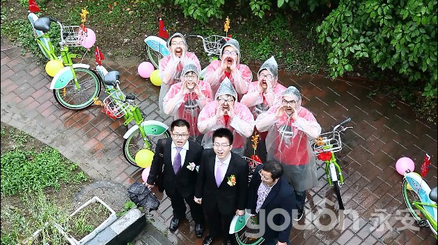 新郎借来20辆公共自行车组成迎亲队伍,冒雨前往新娘家迎娶新娘。新郎杨恺说,因为和新娘家只有几步之遥,租用汽车有些浪费,而且现在都提倡低碳绿色出行,用自行车迎亲既省钱又有个性。新娘张玉倩也有同样愿望。