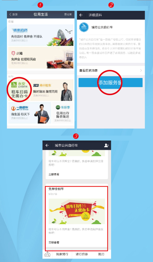 第二步:点击“信用生活”→“永安公共自行车”添加并进入服务窗