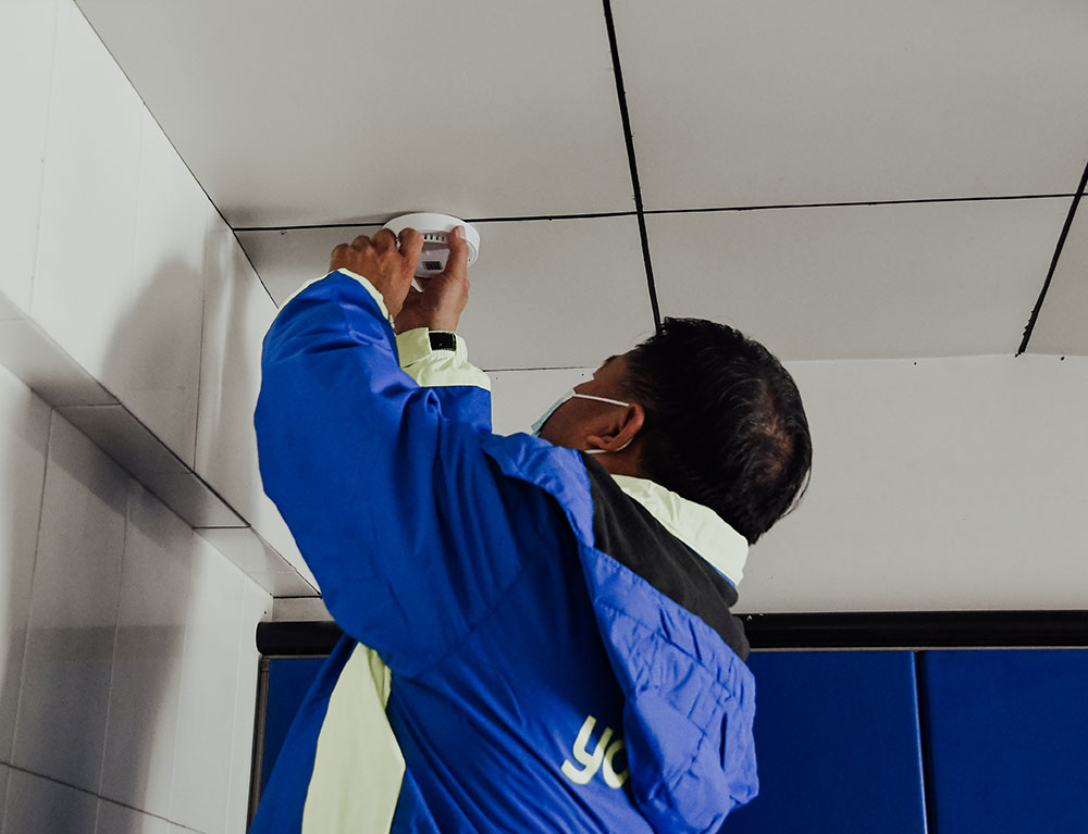 工作人员正在给老人家中安装红外感应器,改设备不需要老人操作,家中发生异常状况会自动向后台反馈。